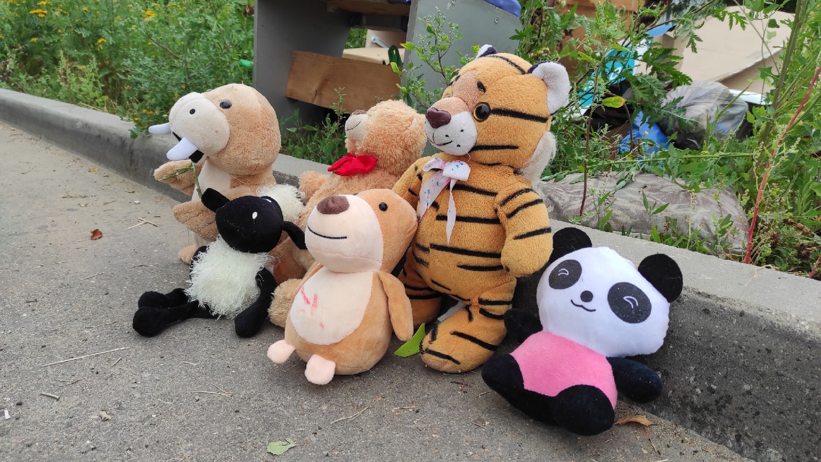 Рядом с контейнерами и кучей мусора мирно сидят рядышком разные зверьки. Неизвестные решили избавиться от мягких игрушек, однако не просто выбросили их в мусорный контейнер, а аккуратно рассадили на виду.