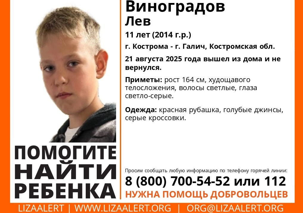 11-летний Лев Виноградов ушел из дома 21 августа и до сих пор не вернулся. На связь мальчик не выходит.