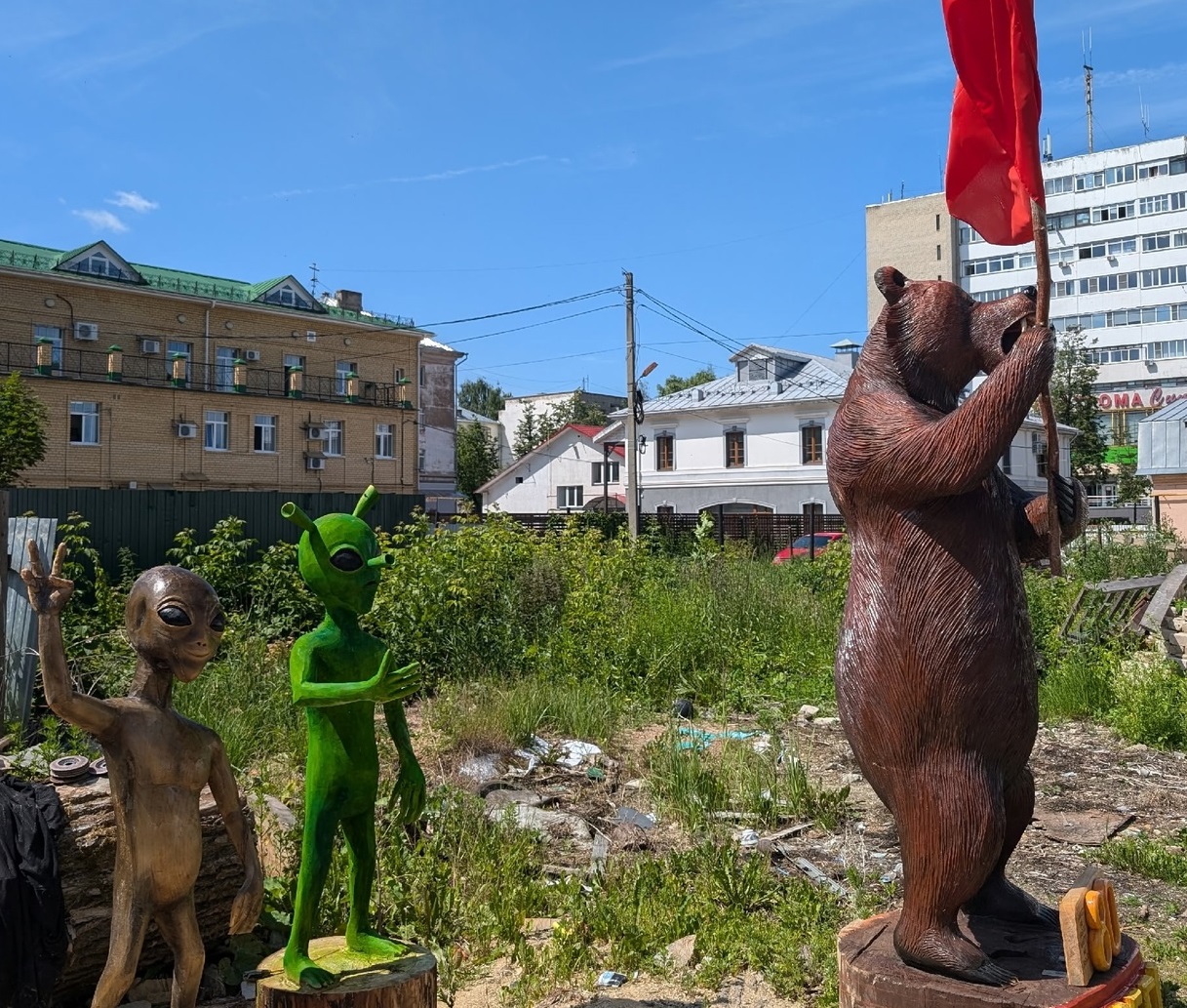 Один рукастый костромич украсил двор на улице Сенной деревянными фигурами, которые мастерил сам. Дворовые арт-объекты понравились горожанам: два инопланетянина и большой медведь с советским флагом встречают прохожих.