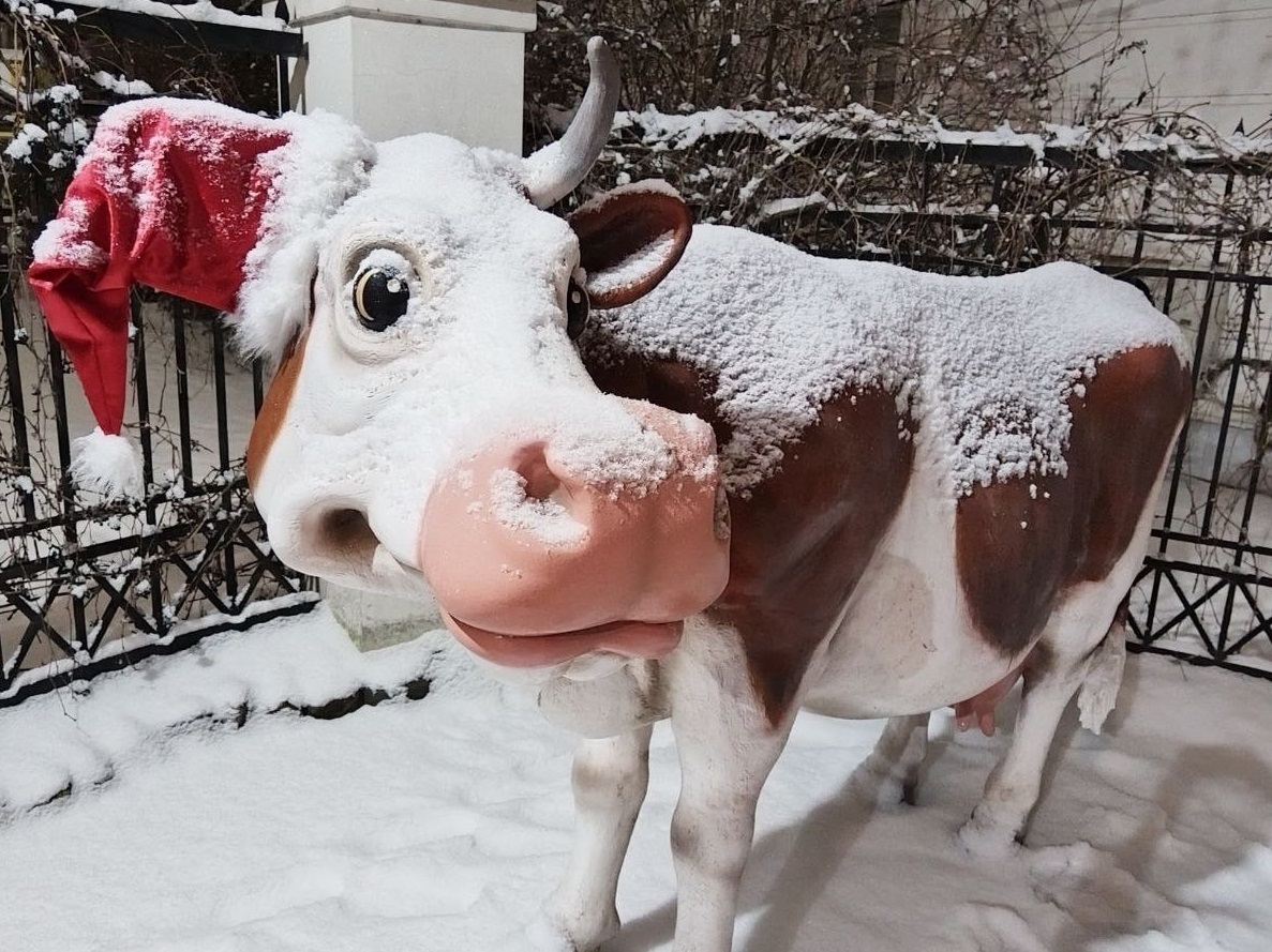 Теперь корова встречает гостей, создавая новогоднее настроение.