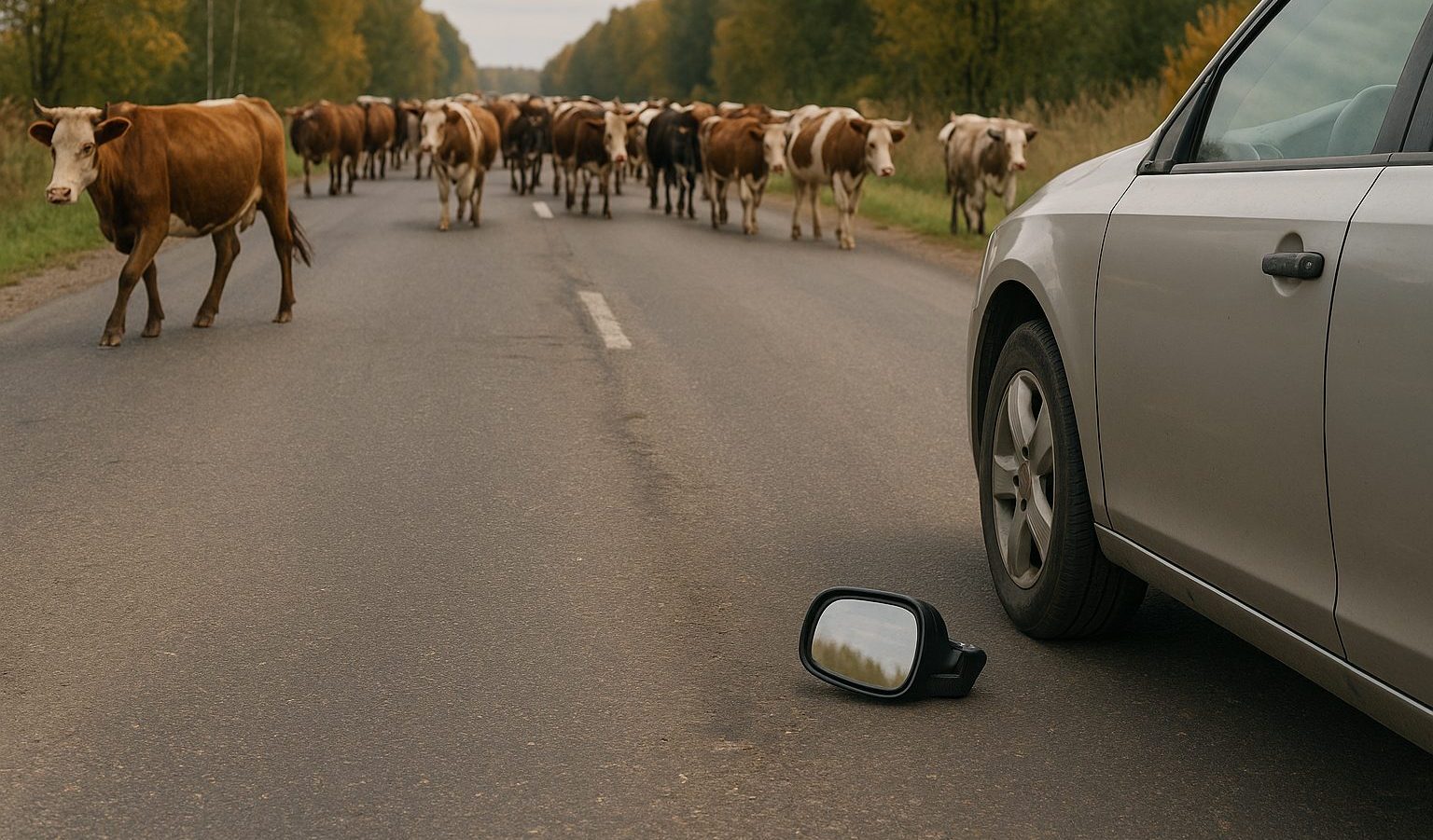 По словам очевидцев, для одного из водителей ситуация закончилась печально: во время движения мужчина задел корову и в итоге остался без бокового зеркала.