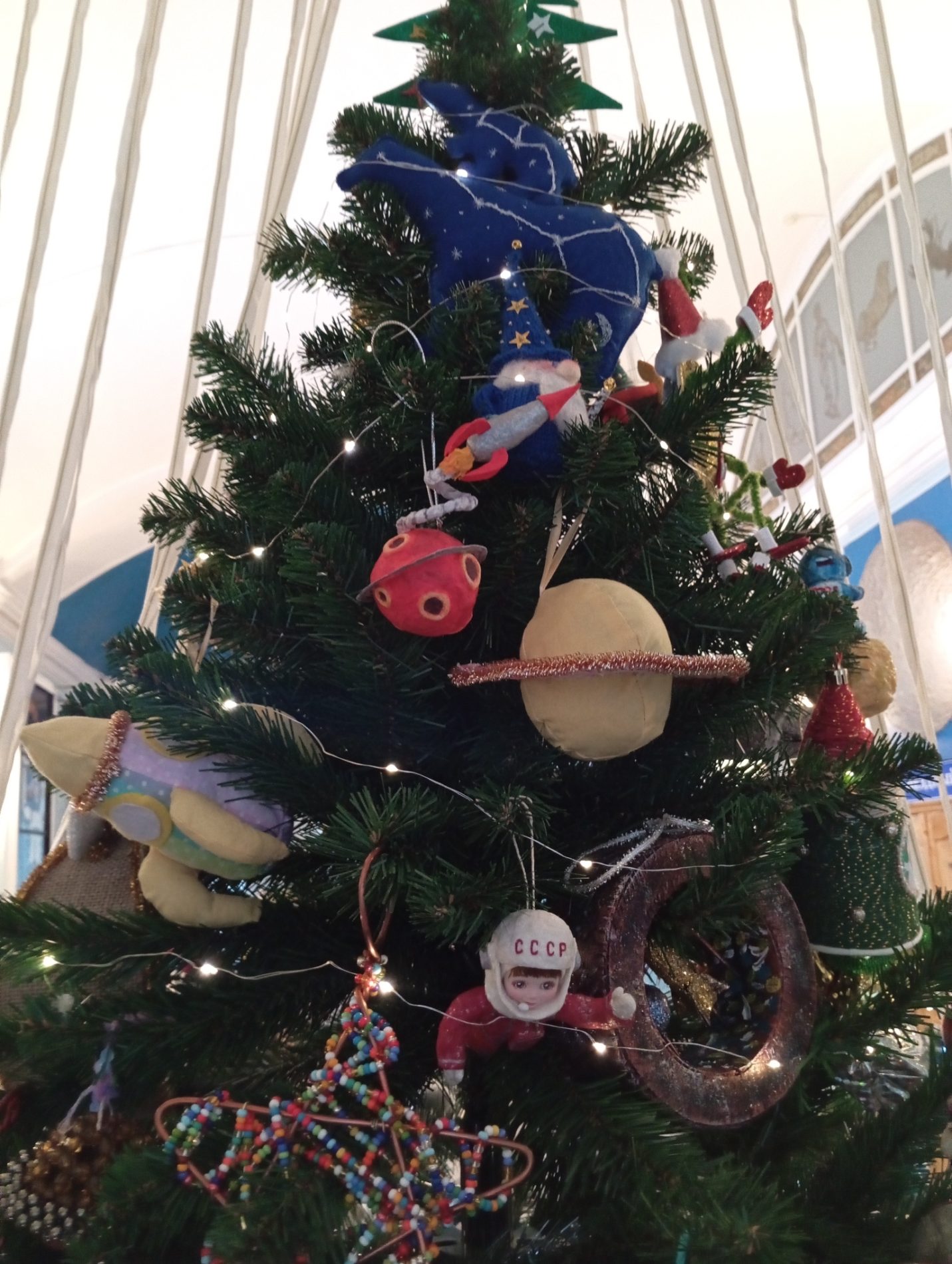 Необычный символ года появился в местном планетарии. Вместо привычных игрушек зеленую красавицу украсили изображениями космонавтов, планет и жителей других миров.