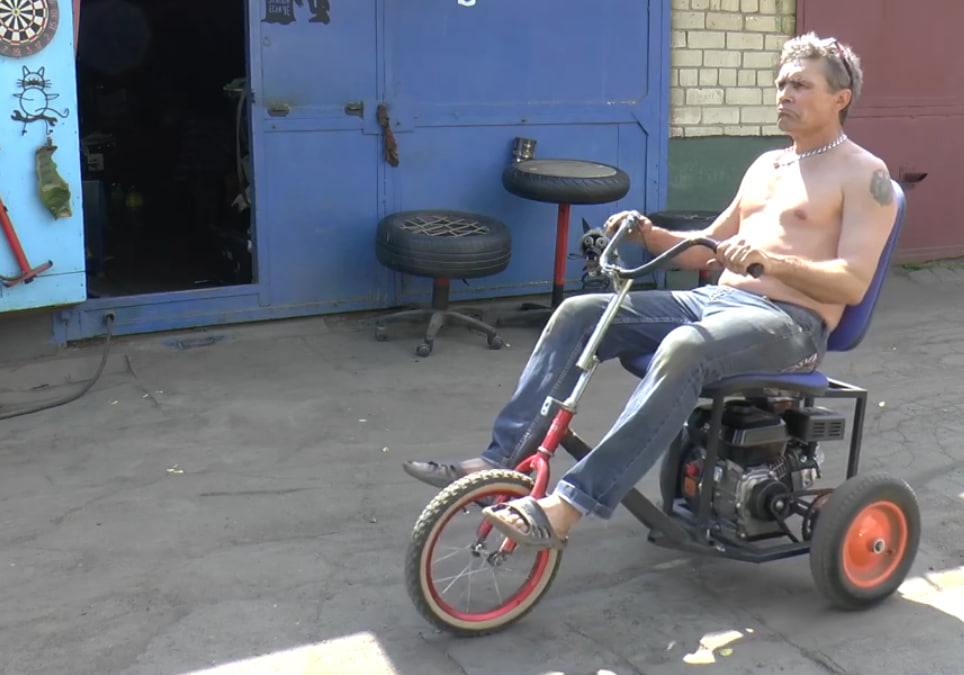 Мужчина смастерил трехколесный велосипед с двигателем. Сиденье в транспорте довольно удобное и похоже на компьютерное кресло, а завести «железного коня» можно с помощью бензинового двигателя.