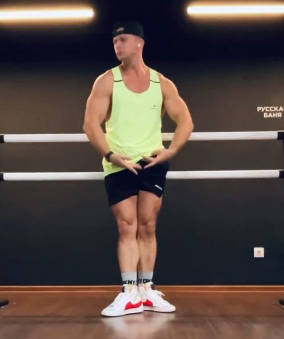 Роман принимает первую позицию — руки внизу, пальцы тянутся друг к другу, локти круглые. Настоящий артист балета! Но из образа быстро выходит и начинает поочередно растягивать мышцы на ногах — делает шпагат прямо на весу.