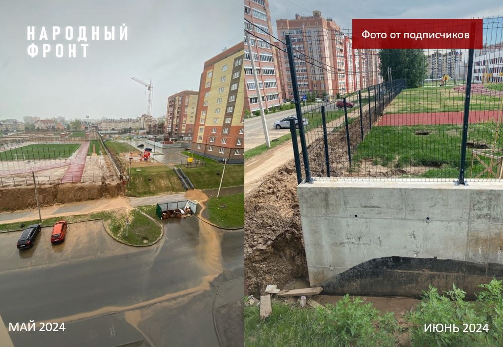 Дети должны пойти в новую школу 1 сентября. Но земляная насыпь уже изрядно пострадала от разгула стихии. На газоне стадиона появилось несколько провалов, а вокруг него дороги усыпаны слоем песка.