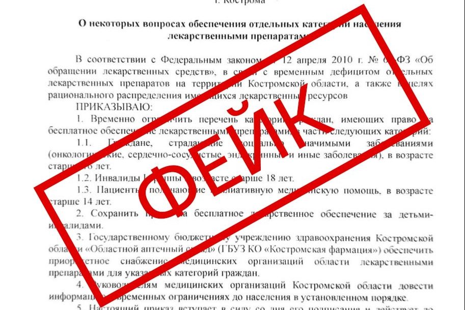 В фейковом приказе, датированном 7 ноября 2025 года и якобы подписанным директором департамента здравоохранения Костромской области Николаем Гириным, говорится, что в регионе временно ограничивают перечень категорий граждан, имеющих право на бесплатное получение лекарственных средств.