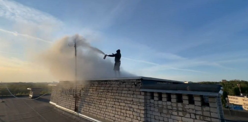 Для экшена в кадре руферы прихватывают разные вещи, которые находят по пути на крышу. Вот, например, подросток играет с огнетушителем.