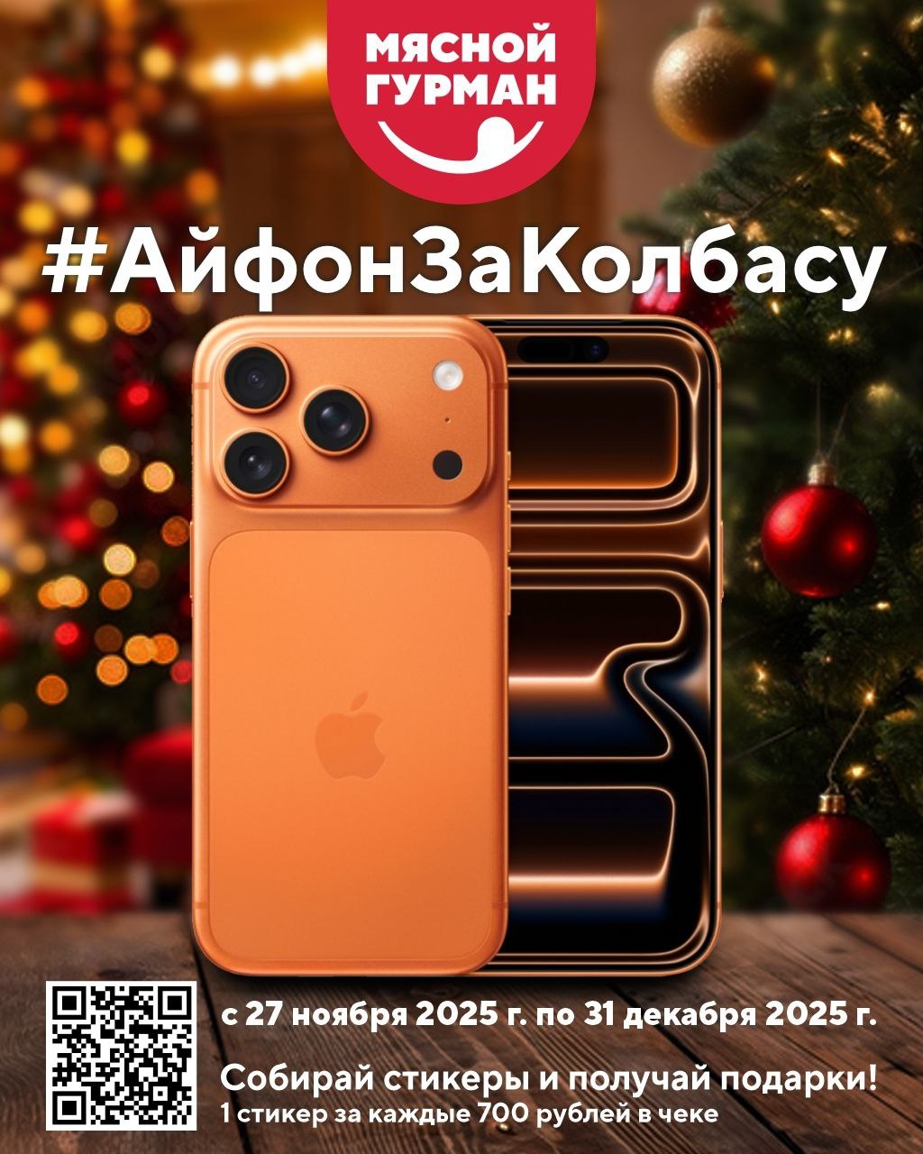 Компания «Мясной гурман» продолжает радовать своих покупателей. Теперь приобретая любимую продукцию, вы можете выиграть iPhone 17 Pro. Согласитесь, отличный подарок на Новый год! Акция #АЙФОНЗАКОЛБАСУ уже стартовала.