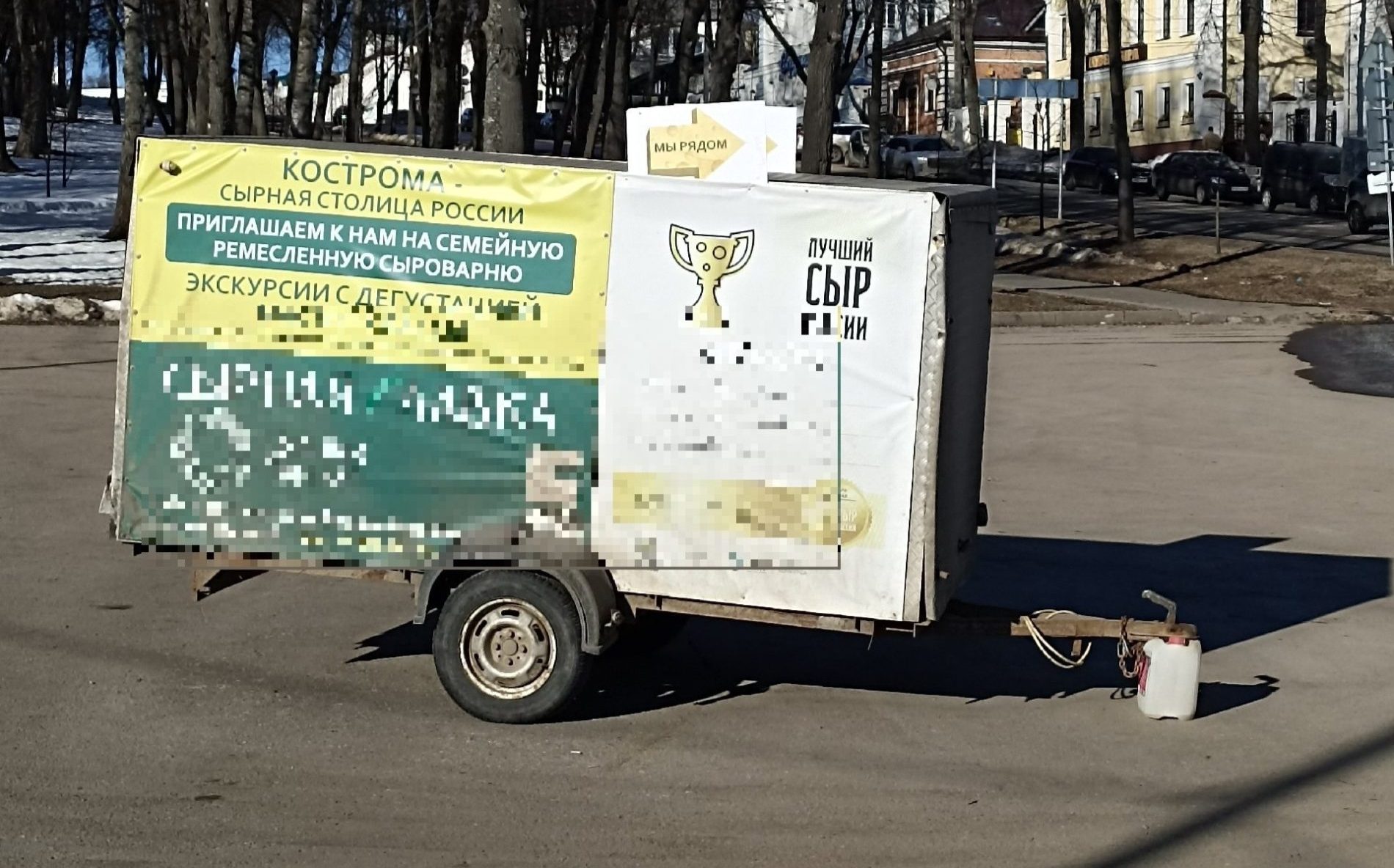 В Костроме местных жителей возмущает странный объект, который, оказывается, уже не первый месяц мозолит глаза гостям и жителям города. Посреди площадки, предназначенной для туристических автобусов, стоит прицеп с рекламной надписью.