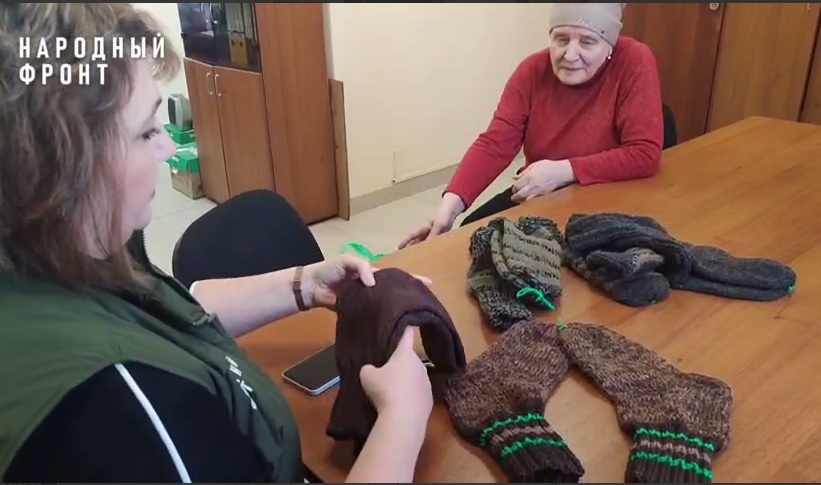 Костромичка принесла в Народный фронт 700 граммов шерстяной пряжи, но поскольку сама она вязать не умеет, попросила найти мастерицу и связать носки для бойцов.