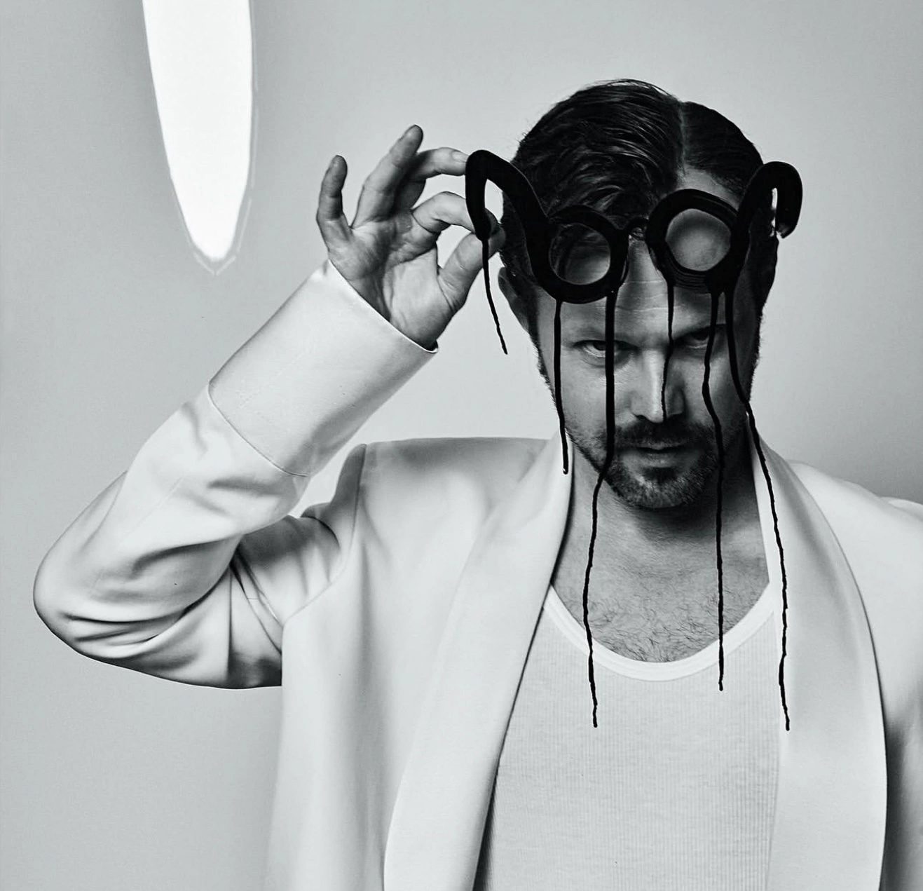 На фото, которое исполнено как будто в черно-белом варианте, он запечатлен в светлые майку, пиджак и брюки. Черные круглые очки, с которых как будто капают слезы в виде нитей, стали стильным акцентом этого портретного снимка.