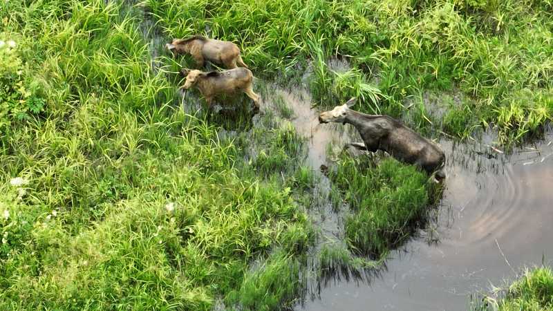 Удача улыбнулась старшему госинспектору Сергею Шкаликову 19 июля. Подняв гаджет в воздух над рекой Сеха, он заметил сразу трех лосей: маму-лосиху и двух малышей. Они плыли по водоему и даже успевали лакомиться травой.