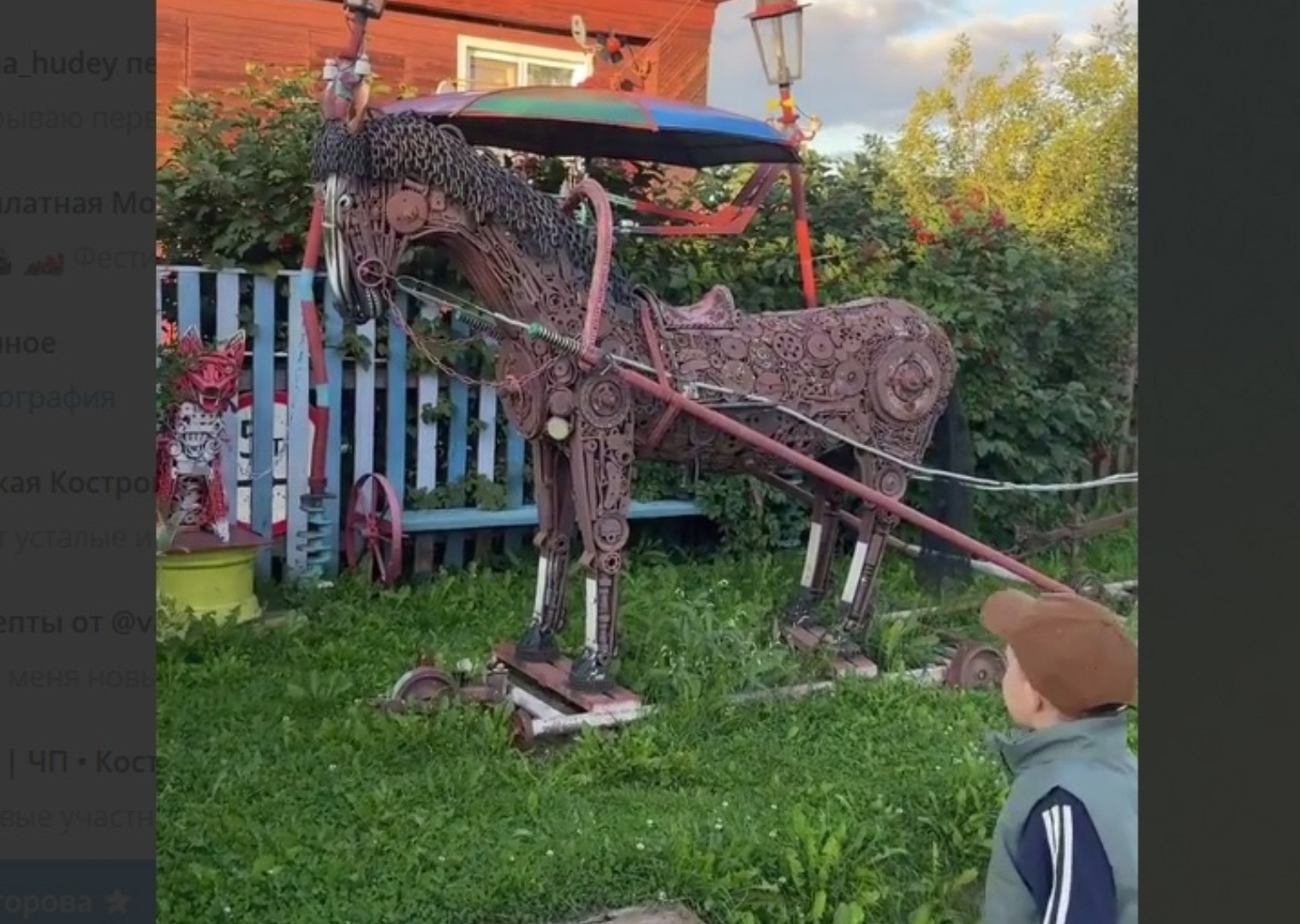 Пассатижи, шестеренки, свечки, подшипники – все это идет в дело для создания удивительных скульптур. Например, хвост у коня сделан из обрезков «кучерявой» сетки-рабицы, а рубаха человека — комбинация стальных прутков, плетение вручную. Сколько тонн ненужных железяк ушло на рождение этих уникальных металлоломных экспонатов, остается только догадываться.