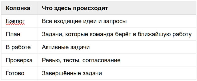 Количество колонок можно менять под особенности команды. Но главное правило — задача должна двигаться слева направо без лишних прыжков.