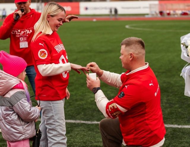 Романтическое событие произошло прямо посреди футбольного матча на костромском стадионе «Урожай»: молодой человек попросил девушку стать его женой.