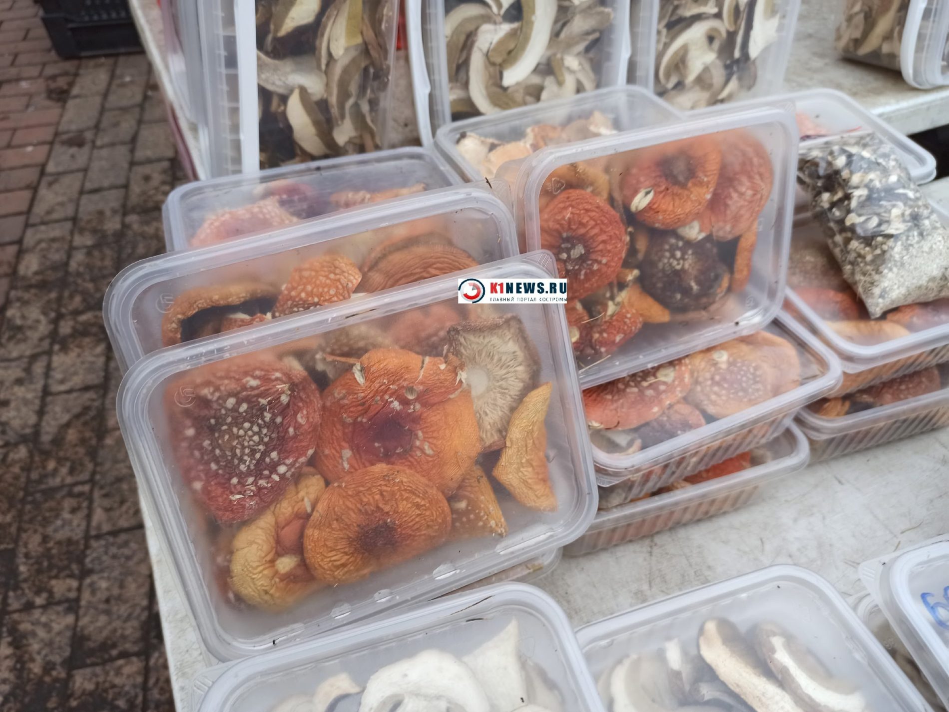 Красные шляпки с белыми горошками старательно высушивают и продают. Просят за небольшой лоточек от 1000 рублей. Для сравнения: за такой же лоточек белых грибов торговцы хотят получить 1300-1500.