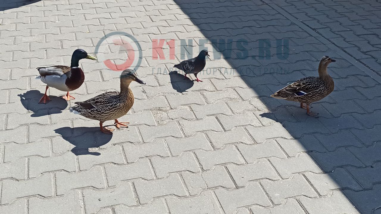 Утки уже настолько привыкли к людям, что спокойно принимают еду от прохожих. При этом сейчас они делят место дислокации с голубями.