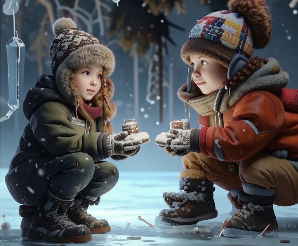 Результат оказался довольно неожиданным. Искусственный интеллект нарисовал двух маленьких детей на льду под елкой. Мальчик и девочка сидят на корточках и держат в руках что-то похожее на свечи или небольшие кексы, а их лица озаряют легкие улыбки.