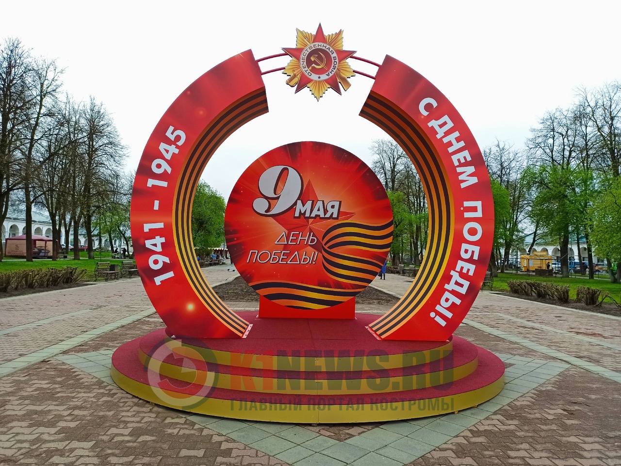 У входа в сквер Ивана Сусанина размещены огромные красочные открытки, которые тоже создают праздничное настроение, несмотря на не самую весеннюю погоду.