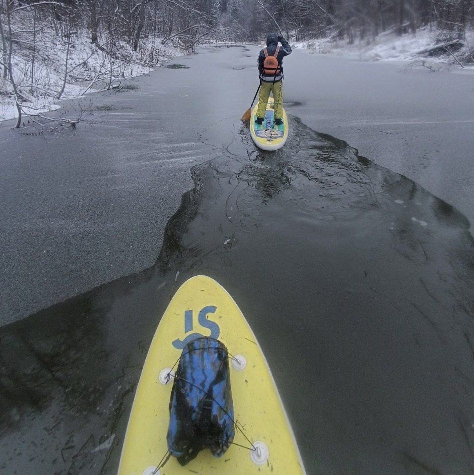 Спортсмен, который уже очень соскучился по лету, возобновил сезон катания на сапборде. Его ничуть не смущала холодная вода и становление льда на водоеме.