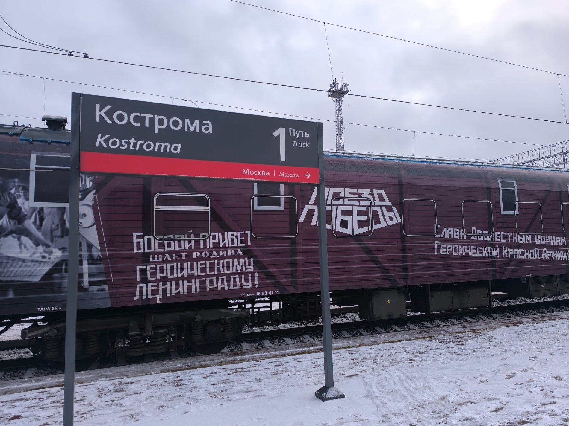В Костроме на два дня сделал остановку Поезд Победы. Этот уникальный патриотический проект едет по железной дороге по многим городам России. 2 и 3 февраля он стоит на станции «Кострома-Новая».
