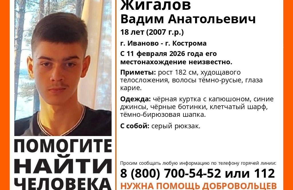 С 11 февраля местонахождение Вадима Жигалова 2007 года рождения неизвестно. Предположительно, молодой человек может находиться в Костроме или Иваново.