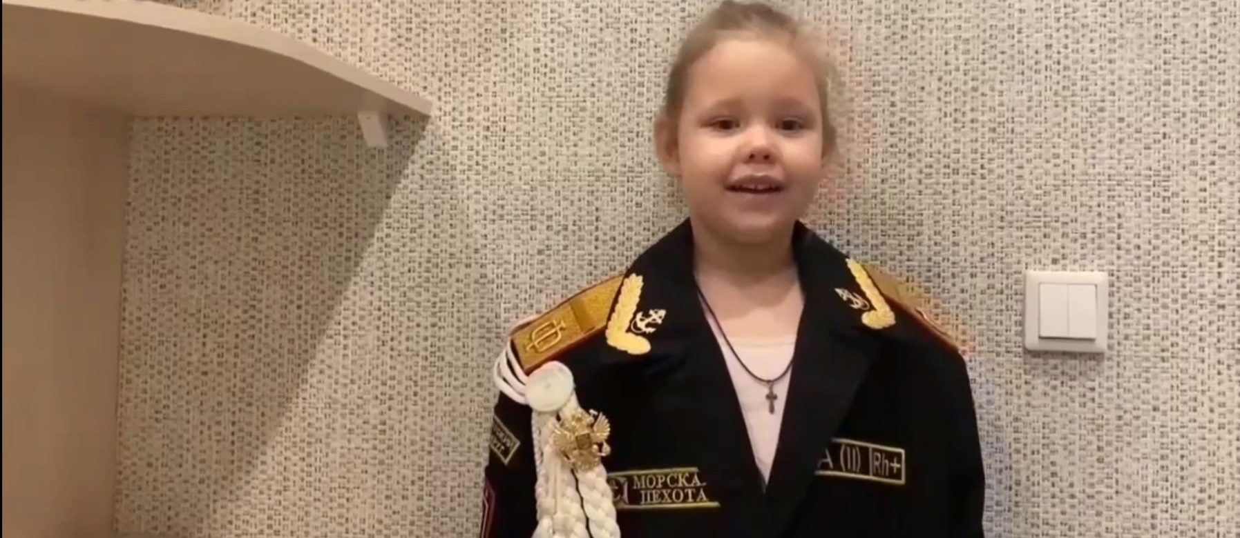 Девчушка уверенно и очень трогательно читает стихи. Перед камерой она стоит в кителе отца — Владимира Рязановский, который погиб в июне прошлого года в Белогоровке во время выполнения боевого задания.