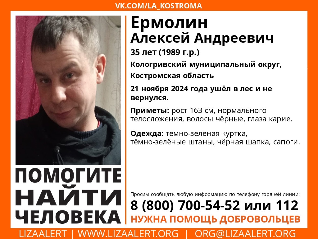Поисковый спасательный отряд «ЛизаАлерт» сообщил приметы жителя Костромской области, который пропал 21 ноября. 35-летний Алексей Ермолин – житель Кологривского муниципального округа. В четверг молодой человек ушел в лес и уже не вернулся. Родственники костромича обратились за помощью к поисковикам.