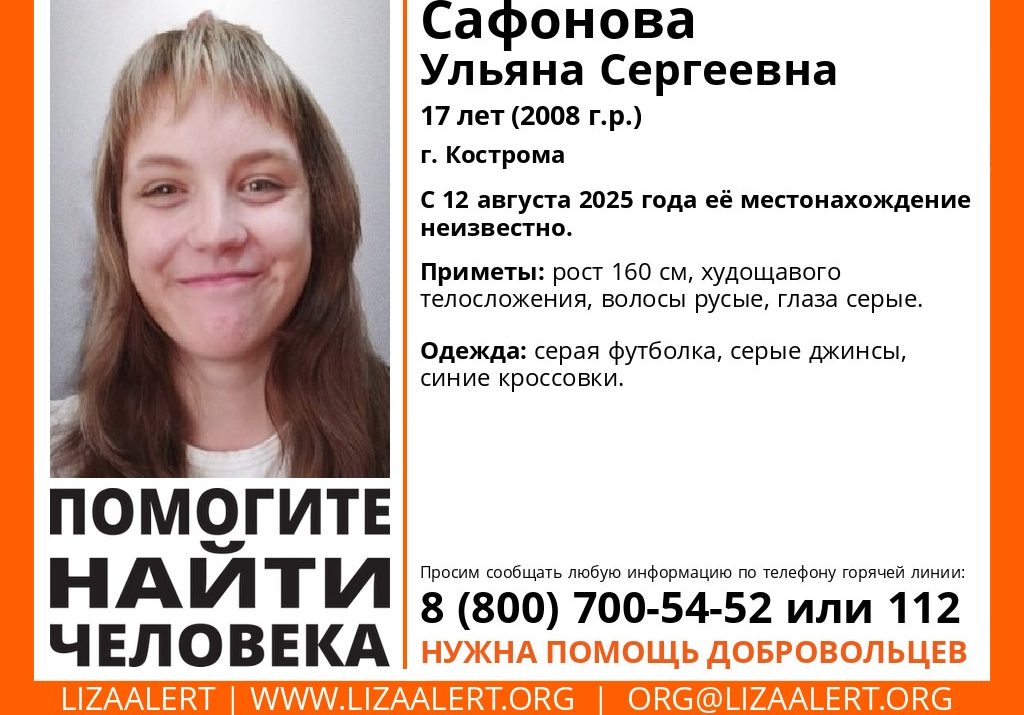 Добровольческий поисково-спасательный отряд «ЛизаАлерт» объявил о розыске 17-летней жительницы Костромы, Ульяны Сафоновой, которая пропала 12 августа.