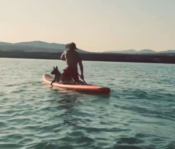 В свои социальные сети артист выложил ролик, где катается на сапборде с улыбчивой овчаркой.