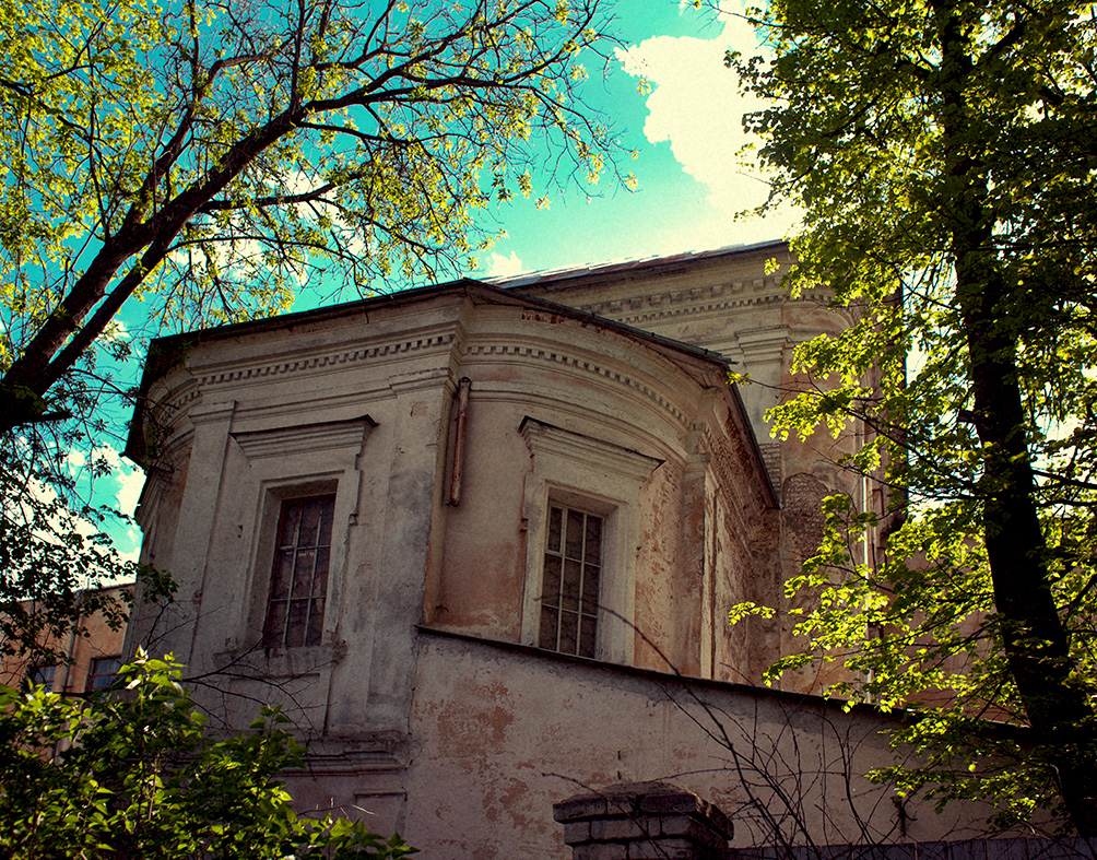 Если обойти здание и посмотреть на него со стороны придомовой территории, то можно заметить сохранившуюся апсиду (свод, примыкающий к основному объему пониженный выступ здания), в которой раньше находился алтарь.