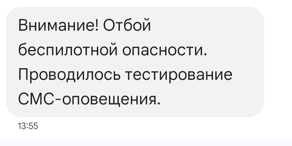 И только через полтора часа стало понятно, что это было. Новое уведомление гласило: «Отбой беспилотной опасности. Проводилось тестирование СМС-оповещения«.
