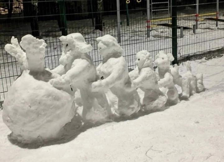 В новогодние каникулы местные жители старались отдохнуть, как следует, и разнообразить свой досуг. Кто-то лепил традиционных снеговиков возле дома, а другие решили пойти дальше, и слепили целую скульптурную группу — иллюстрацию к русской народной сказке «Репка».