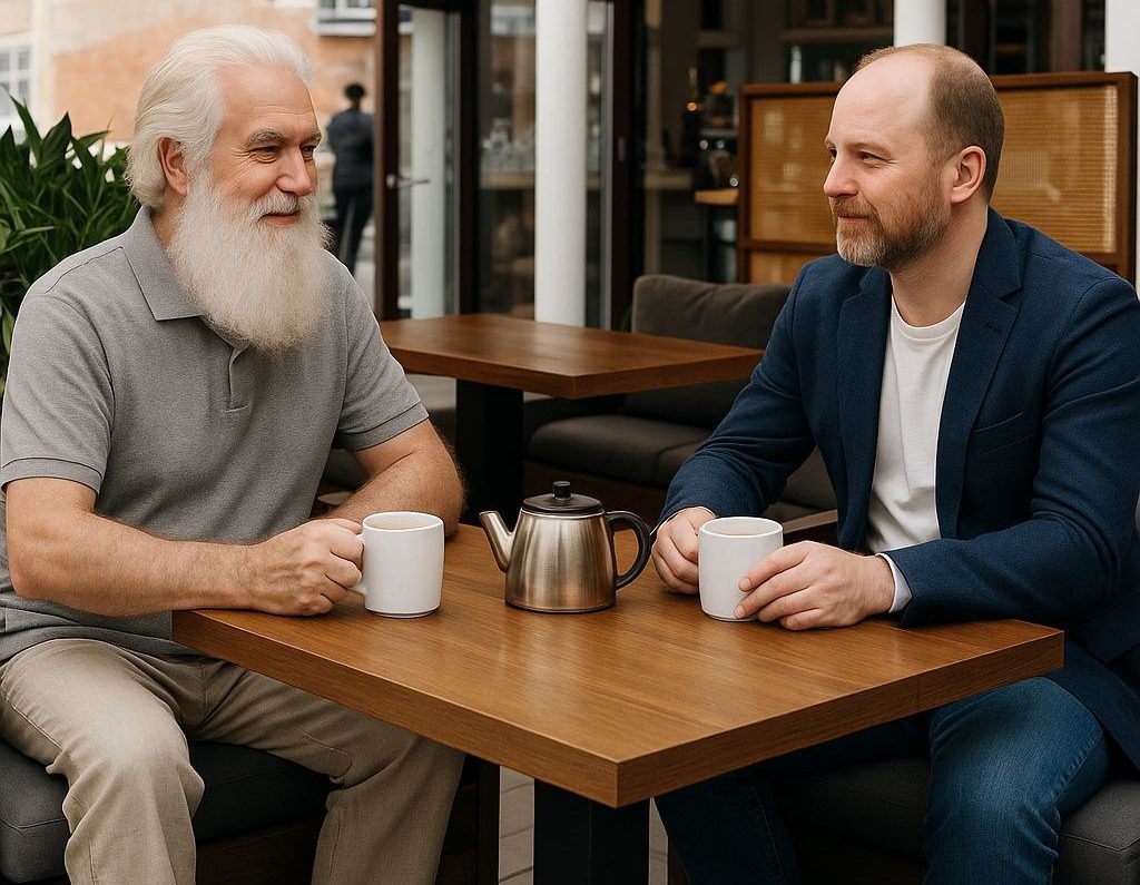 Под уютным зонтом две исторических личности, пусть и с налетом искусственного интеллекта, обсуждали новости, спорили о капризах погоды и с теплотой вспоминали старую Кострому — времена, когда интернета не было, а чай пили, не торопясь.