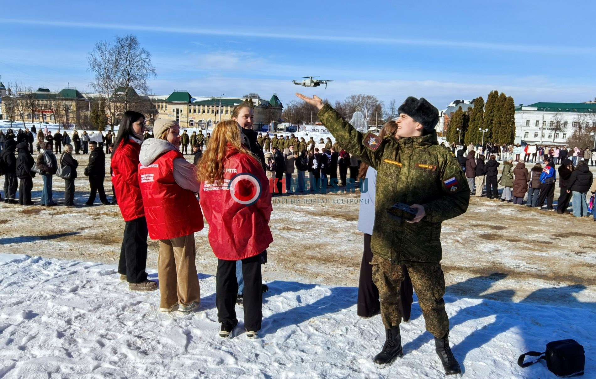 Весенняя музыка, яркие плакаты и сотни тюльпанов — так в центре Костромы поздравляли женщин с наступающим 8 Марта. Около 500 студентов вышли на праздничную акцию «Позывной: мама, жена, дочь, сестра», организованную «Волонтерской ротой Боевого Братства».