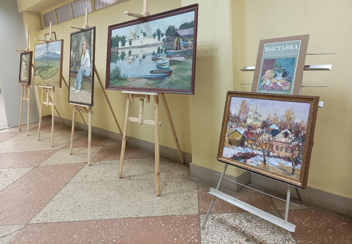 В рекреации корпуса В1 Костромского госуниверситета перед избирательным участком на ул. 1-го Мая, 14а, выпускники КГУ представили свои картины. Все они выполнены в жанрах пейзаж и портрет.