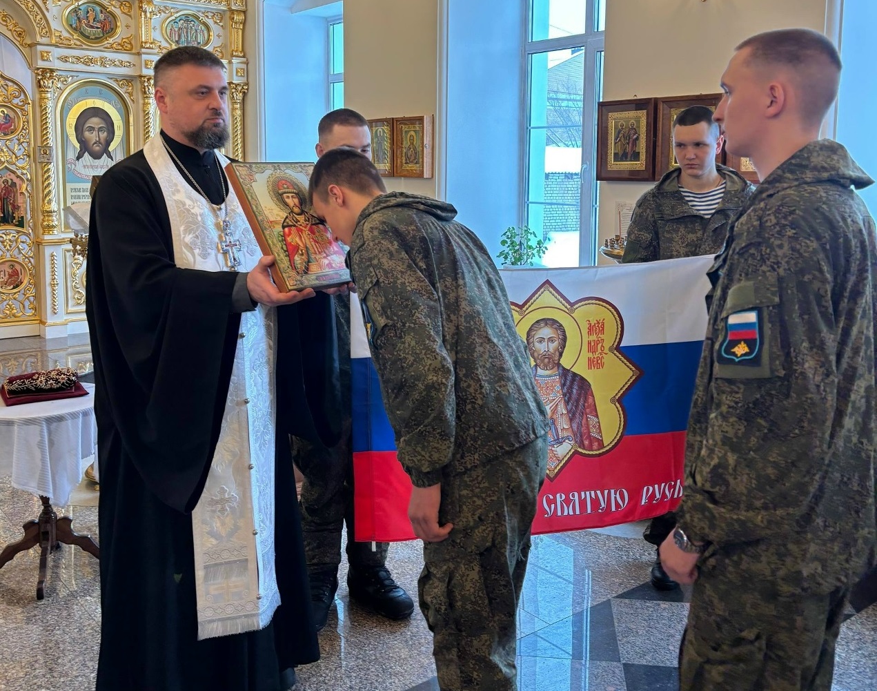 Ее передала в рамках патриаршей программы «Духовное укрепление российского воинства» исполнитель программы-президент Благотворительного Фонда «Святого мученика Вонифатия» Наталья Мезенцева.