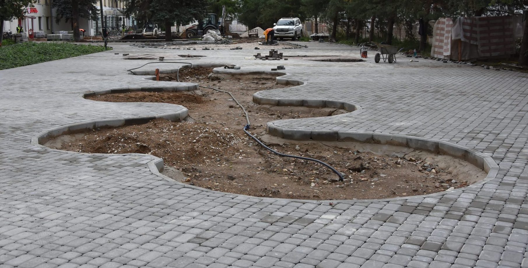 Фонтан в виде ручья с колонками установят в сквере около театра кукол. Рабочие на две трети уже выполнили мощение пешеходных дорожек тротуарной плиткой. На территории общественного пространства прокладывают электрический и оптоволоконный кабели, монтируют закладные детали для устройства наружного освещения.