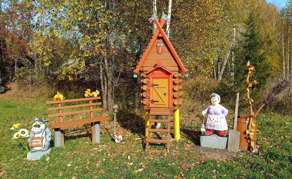 Бабуля тут обитает совсем не злая. И жилье на курьих ножках у нее симпатичное. Под крышей обосновался верный фамильяр-филин, у порога растут красные мухоморы. Хозяйственная Яга сушит глиняный кувшин на жердочке, а охраняет избушку знаменитый волк из мультфильма: того гляди, запоет.