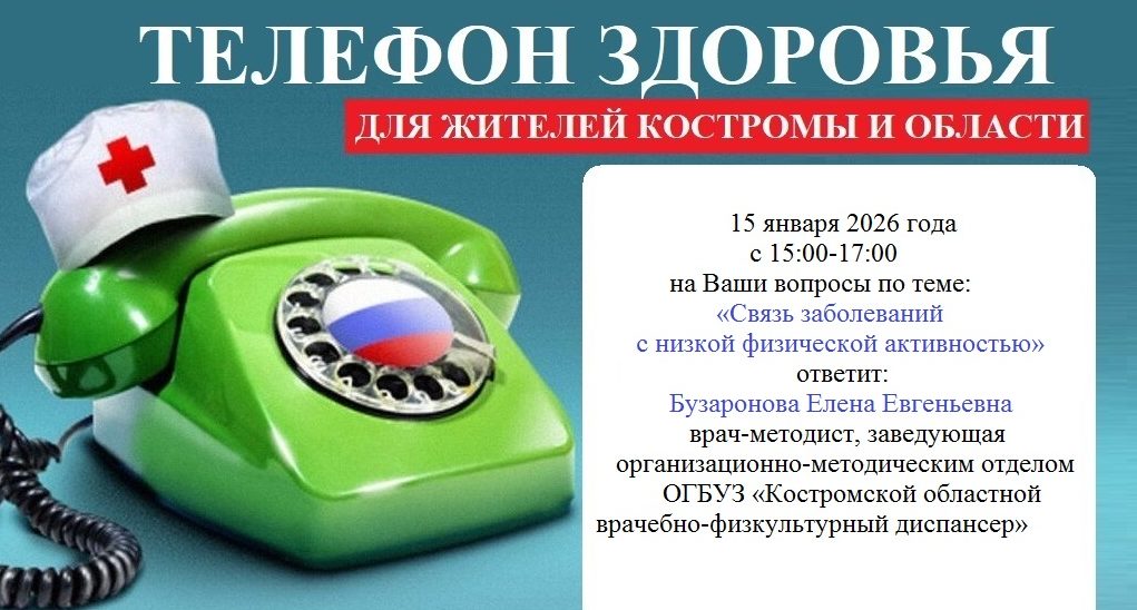 «Телефон здоровья» — еженедельное профилактическое мероприятие. Каждый четверг с 15 до 17 часов по бесплатному номеру 8-800-450-03-03 может позвонить любой житель Костромской области и задать вопрос врачам.