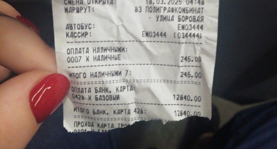 Эта крупная сумма списана не с одного конкретного пассажира, а с 428-ми человек. Именно столько прошли через валидаторы в салоне автобуса за 15-часовую смену — с 4.48 утра до 19.46 вечера 18 марта. Это видно при внимательном знакомстве с чеком. Кстати, там отражены даже 245 рублей – это деньги, которые принял водитель от семи пассажиров в виде оплаты проезда наличными.