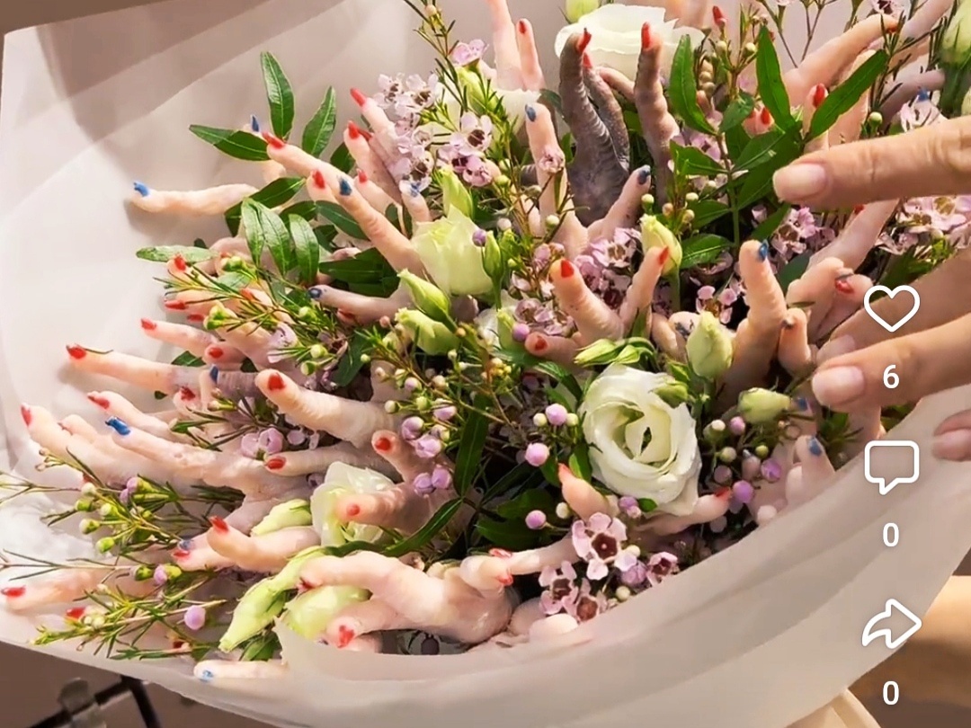 Букет с наманикюренными куриными лапами синюшного цвета подарили имениннице в областном центре.
