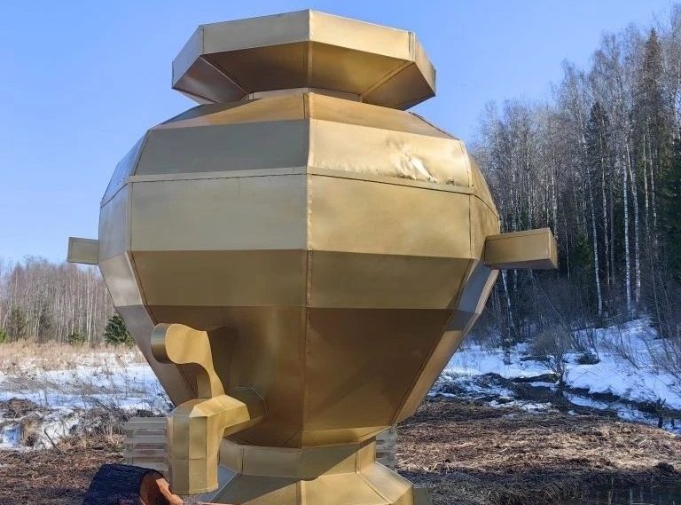 Конструкция выглядит как настоящий герой русского чаепития: массивный, золотистый, с краником и даже с «заварником» сверху. Рядом — лавка из бревна, так что можно не просто сфотографироваться, а будто бы присесть «на чай».