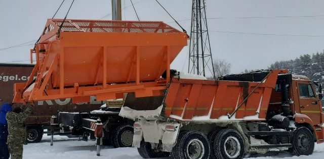 Организация получила шесть комплектов быстросъемного навесного оборудования. В каждый набор входят пескоразбрасыватель и отвал. Оборудование крепится к обычным самосвалам — и буквально за короткое время грузовая машина превращается в снегоуборочную.