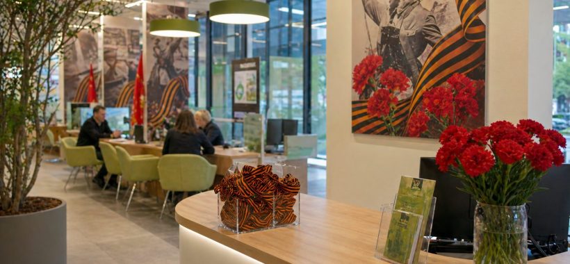 Режим работы Сбера в майские праздники: ко Дню Победы банк подготовил георгиевские ленты и тематически оформил крупнейшие офисы