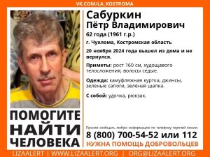 62-летний Петр Сабуркин ушел из дома в Чухломе 20 ноября и не вернулся. Известны приметы мужчины: рост: 160 см, телосложение…