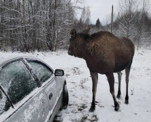 Необычная встреча произошла утром в Вохме. Местные жители вышли прогреть машину — и буквально столкнулись с лосем прямо во дворе….