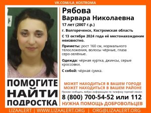 Об исчезновении 17-летней Варвары Рябовой из Волгореченска сообщили в группе ЛизаАлерт. Девушка пропала 13 октября, ее пока не нашли. Приметы:…
