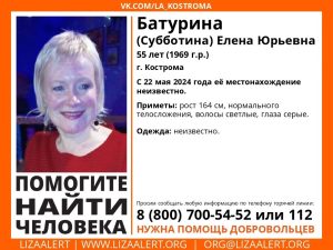 Пропала 55-летняя Елена Батурина (Субботина). С 22 мая ее местонахождение неизвестно. Приметы пропавшей костромички: рост 164 см, среднего телосложения, светлые…