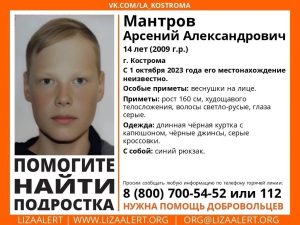 Как сообщает костромской поисковый отряд «ЛизаАлерт» в областном центре пропал 13-летний Игнатов Кирилл. С 29 августа 2023 года его местонахождение неизвестно….